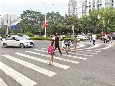 ■放学后,家长和学生通过没有红绿灯的人行横道。