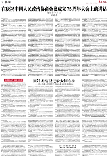 75年前,毛泽东同志在新政治协商会议筹备会上的讲话中豪迈地指出:“中国人民将会看见,中国的命运一经操在人民自己的手里,中国就将如太阳升起在东方那样,以自己的辉煌的光焰普照大地,迅速地荡涤反动政府留下来的污泥浊水,治好战争的创伤,建设起一个崭新的强盛的名副其实的人民共和国。”75年来,中国共产党团结带领全国各族人民不懈奋斗,创造了令世界刮目相看的伟大成就,中国式现代化正在全面推进,中华民族正以不可阻挡的步伐迈向伟大复兴。我们相信,在中国共产党坚强领导下,人民政协一定能够为以中国式现代化全面推进强国建设、民族复兴伟业作出新的更大贡献! (新华社北京9月20日电)