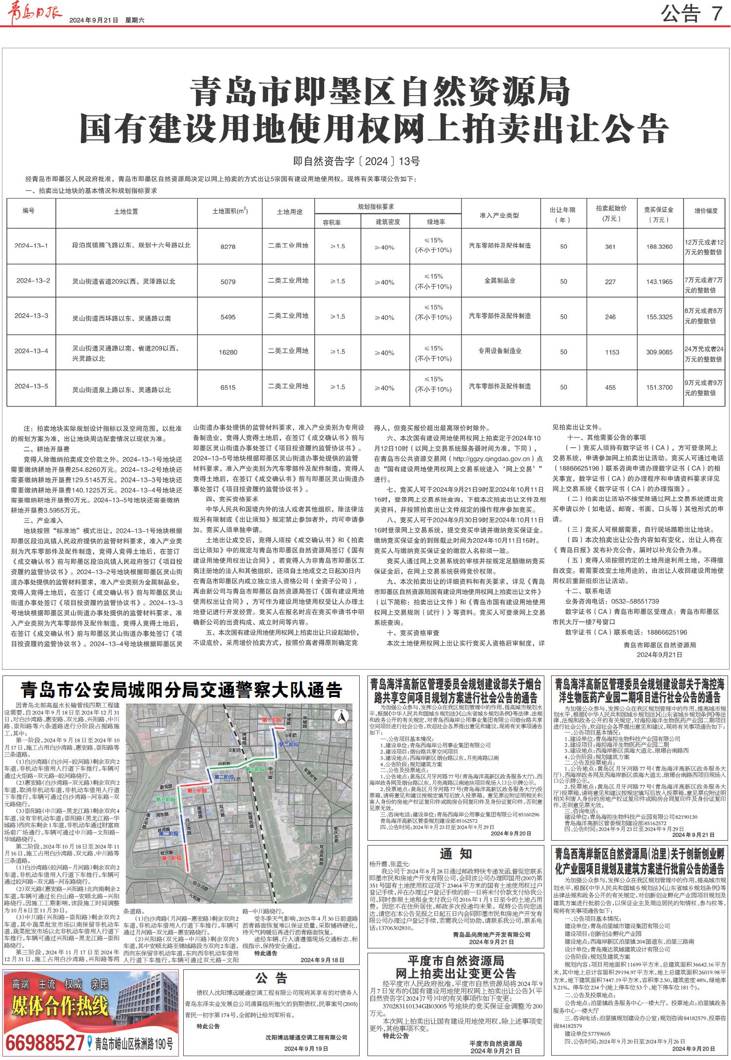 青岛市即墨区自然资源局国有建设用地使用权网上拍卖出让公告