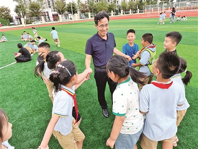 ■鲁敬华与孩子们做游戏。 韩 星 摄