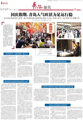 国庆假期期间,青岛市场繁荣、运行有序。各区市共同发力,推出一批文旅新场景、新模式,为市民游客“解锁”文旅消费新体验,满足市民游客的多元化需求。市场监管系统、城市管理系统等工作人员坚守岗位一线,消费市场秩序总体平稳,城市平稳有序运行。