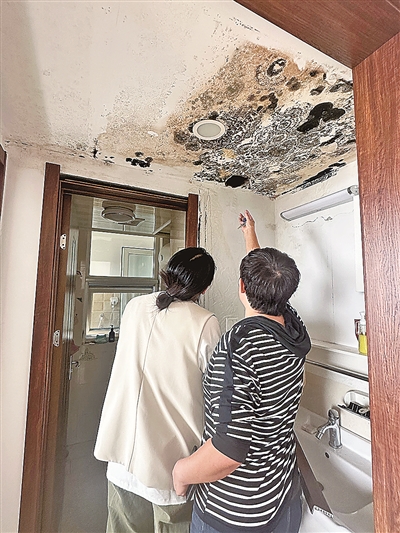 10月9日上午,记者在林女士租住的公租房中看到,洗手台上方的棚顶位置出现不少黑色斑点。受漏水影响,棚顶处破了一个洞,能看到上方水管,洗手间门框也已严重变形。“洗手台上面原来有一面镜子,漏水导致墙上的胶失效,镜子脱落摔碎了,我那天回家看到地上的碎片还吓了一跳。”林女士告诉记者,她8月10日第一次发现漏水问题,已影响自己的正常生活。