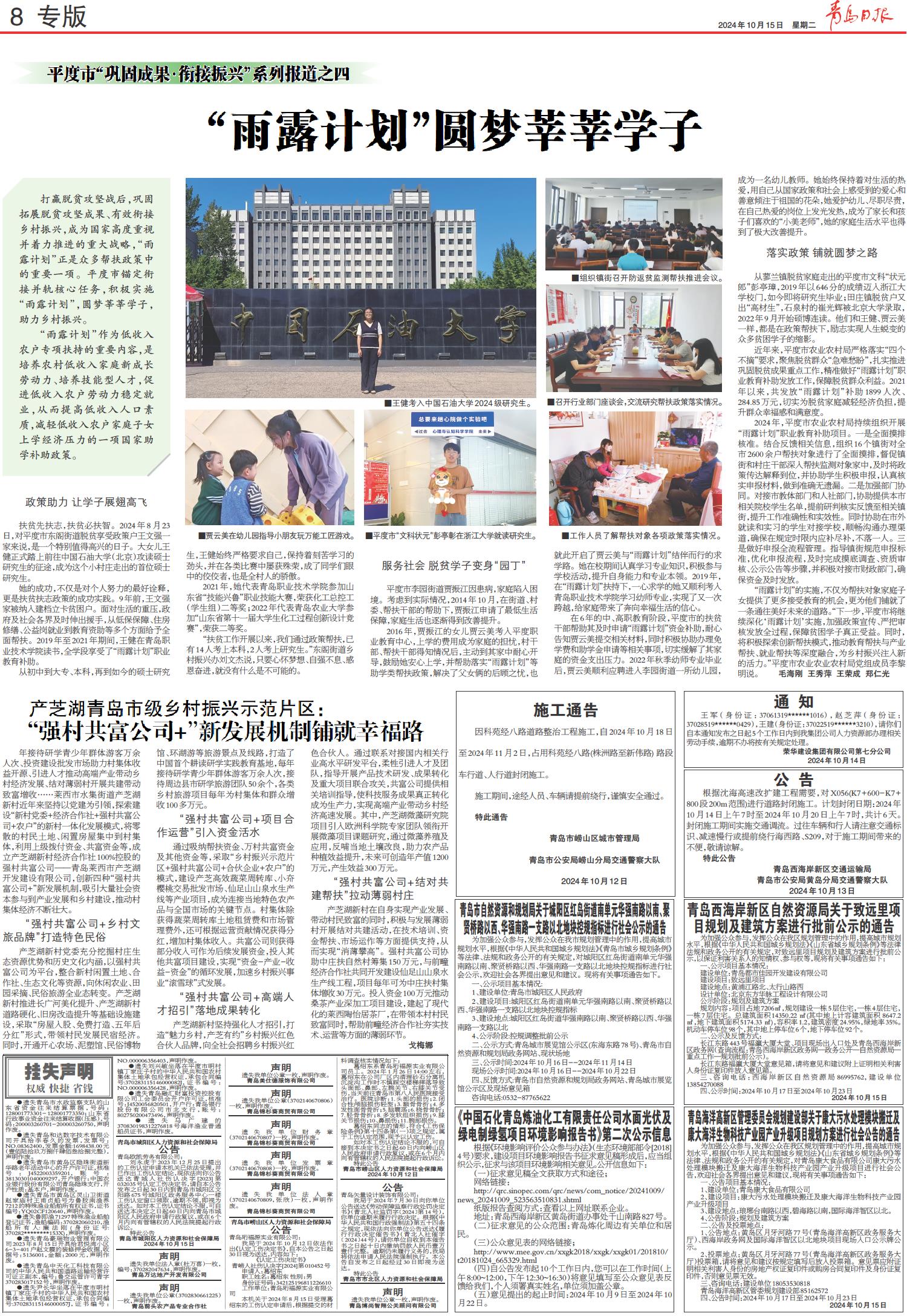 2024年,平度市农业农村局持续组织开展“雨露计划”职业教育补助项目。一是全面摸排核准。结合反馈相关信息,组织16个镇街对全市2600余户帮扶对象进行了全面摸排,督促镇街和村庄干部深入帮扶监测对象家中,及时将政策传达解释到位,并协助学生积极申报,认真核实申报材料,做到准确无遗漏。二是加强部门协同。对接市教体部门和人社部门,协助提供本市相关院校学生名单,提前研判核实反馈至相关镇街,提升工作准确性和实效性。同时协助在市外就读和实习的学生对接学校,顺畅沟通办理渠道,确保在规定时限内应补尽补,不落一人。三是做好申报全流程管理。指导镇街规范申报标准,优化申报流程,及时完成摸底调查、资质审核、公示公告等步骤,并积极对接市财政部门,确保资金及时发放。