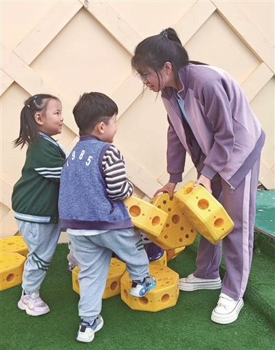 ■贾云美在幼儿园指导小朋友玩万能工匠游戏。