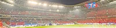 【同期声】 外地球迷王鑫:“早就听说青春足球场的大名,这次就想一睹为快。还没进场,只看外观就被震撼到了。入场之后,草坪、座椅、灯光等处处体现着‘国际范’,特别气派,观赛氛围感直接拉满。”