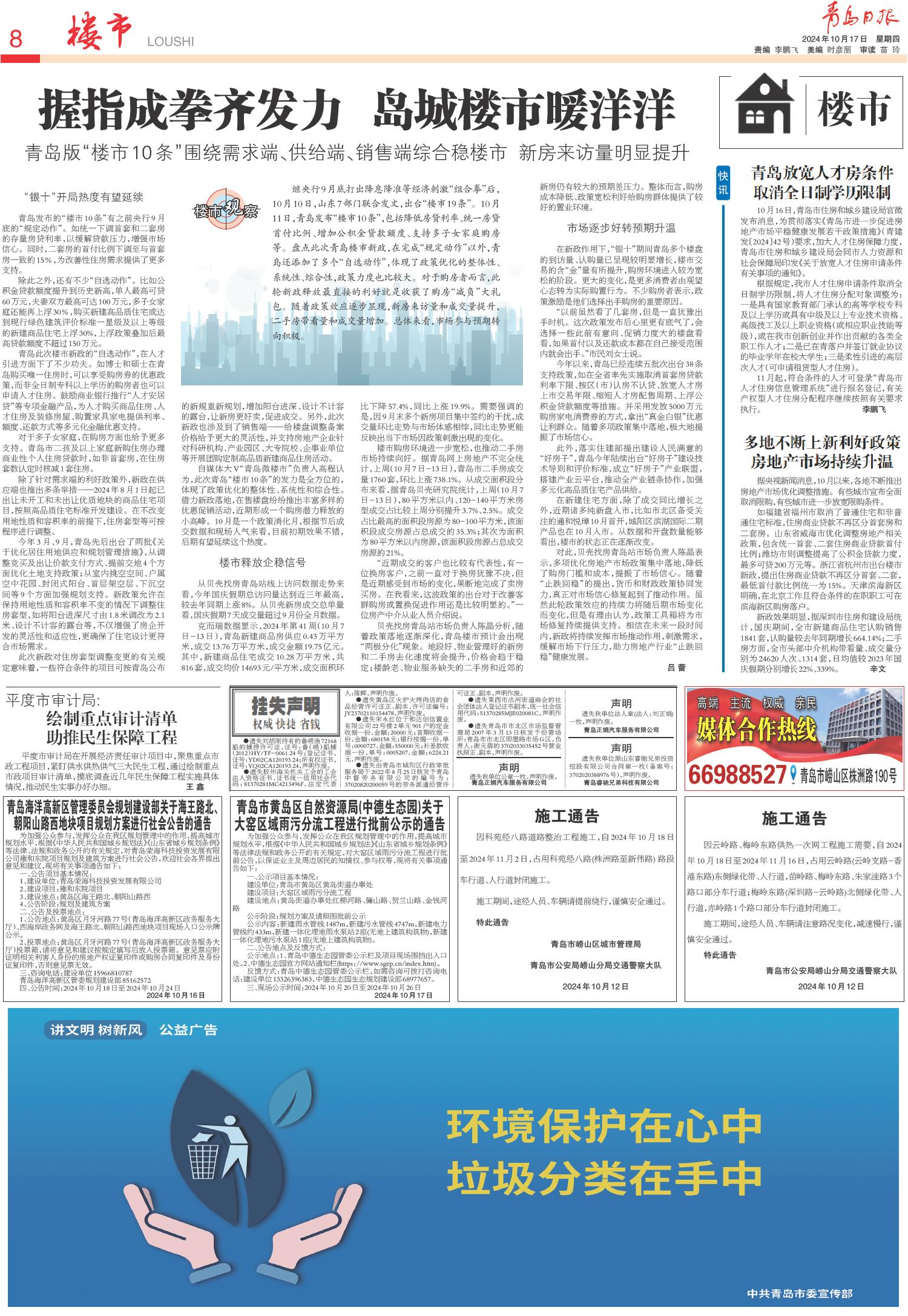 01 首版 02 要闻 03 青报聚焦 04 国内·国际 05 理论周刊 06 幸福市北 07 幸福市北 08 楼市