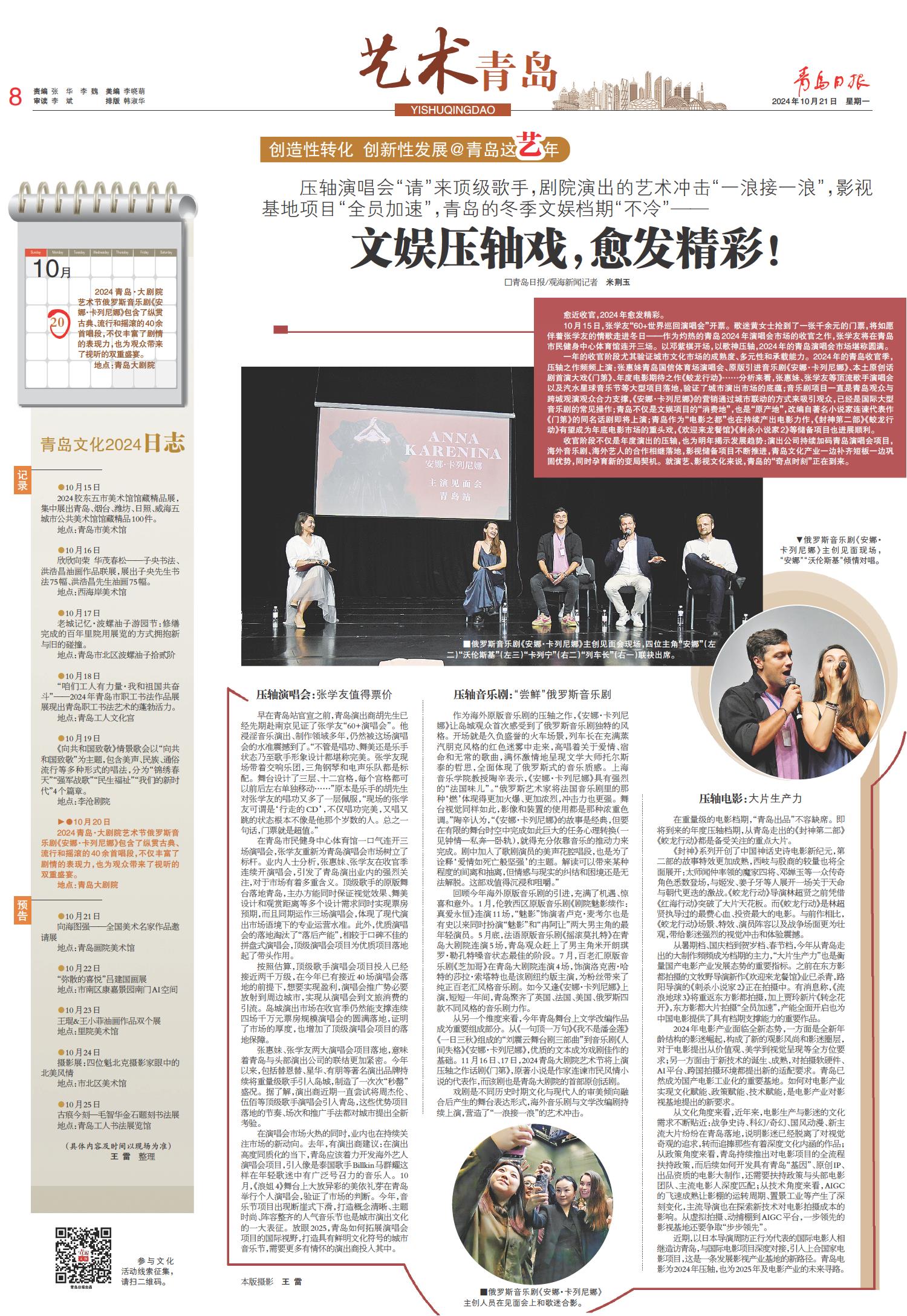 一年的收官阶段尤其验证城市文化市场的成熟度、多元性和承载能力。2024年的青岛收官季,压轴之作频频上演:张惠妹青岛国信体育场演唱会、原版引进音乐剧《安娜·卡列尼娜》、本土原创话剧首演大戏《门第》、年度电影期待之作《蛟龙行动》……分析来看,张惠妹、张学友等顶流歌手演唱会以及汽水星球音乐节等大型项目落地,验证了城市演出市场的底蕴;音乐剧项目一直是青岛观众与跨城观演观众合力支撑,《安娜·卡列尼娜》的营销通过城市联动的方式来吸引观众,已经是国际大型音乐剧的常见操作;青岛不仅是文娱项目的“消费地”,也是“原产地”,改编自著名小说家连谏代表作《门第》的同名话剧即将上演;青岛作为“电影之都”也在持续产出电影力作,《封神第二部》《蛟龙行动》有望成为年底电影市场的重头戏,《欢迎来龙餐馆》《刺杀小说家2》等储备项目也进展顺利。
