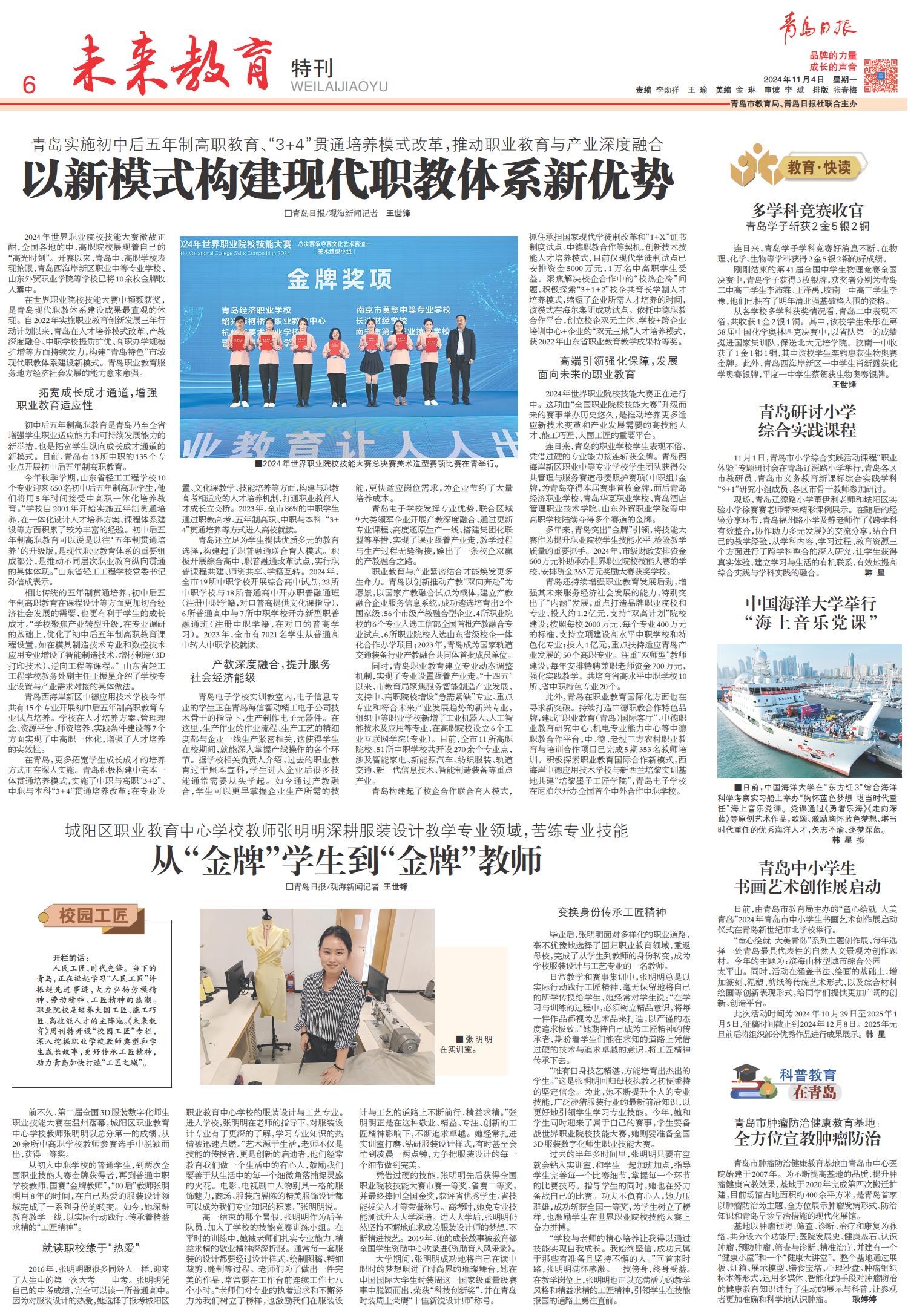 人民工匠,时代先锋。当下的青岛,正在掀起学习“人民工匠”许振超先进事迹,大力弘扬劳模精神、劳动精神、工匠精神的热潮。职业院校是培养大国工匠、能工巧匠、高技能人才的主阵地。《未来教育》周刊特开设“校园工匠”专栏,深入挖掘职业学校教师典型和学生成长故事,更好传承工匠精神,助力青岛加快打造“工匠之城”。