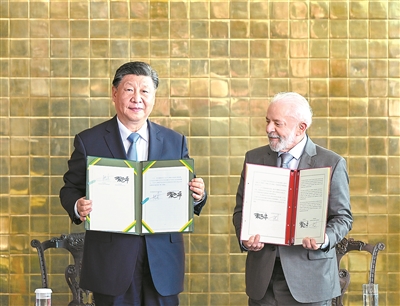 我们就中巴关系未来发展达成新的战略共识,其中最重要的是,我们共同决定将双边关系提升为携手构建更公正世界和更可持续星球的中巴命运共同体,同时将共建“一带一路”倡议同巴西发展战略对接。在世界格局加速演变的背景下,这体现了中巴两个发展中大国识变、应变、求变的决心,必将推动两国关系继往开来、开启下一个“黄金50年”,同时为全球南方国家团结自强树立榜样,为提升发展中国家在全球治理中的代表性和发言权作出新的贡献。
