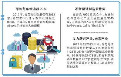 2017年,青岛高企数量仅有2053家;到2023年,这个数字已经接近8000。七年间,青岛高企以平均每年超29%的增速壮大着规模
