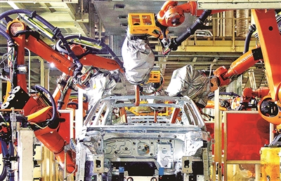 ■今年以来,即墨区车企铆足干劲抓生产、拓市场,呈现产销两旺的良好态势。图为即墨区一汽大众青岛基地焊装车间,机器人在焊接作业。