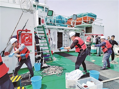 ■环境监测人员合力拉拽浮游生物网。