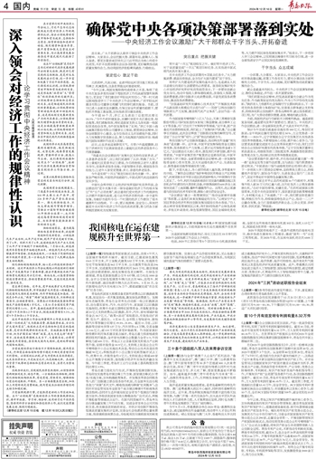 这次中央经济工作会议部署明年工作重点任务,排在第一位的就是“大力提振消费、提高投资效益,全方位扩大国内需求”,体现的正是对总供给和总需求的高效统筹,是对经济规律的深刻运用。实施提振消费专项行动,加力扩围实施“两新”政策,更大力度支持“两重”项目,这些政策举措既立足当下、又着眼长远,必将有效激发内需潜能,夯实做大国内大循环,更好地带动国内国际双循环。