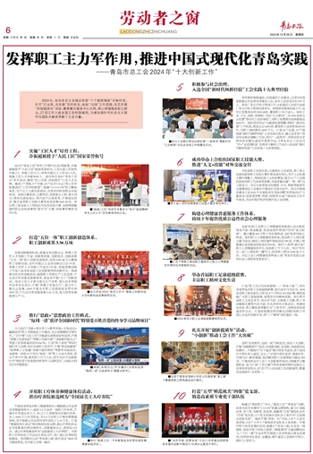 2024年,青岛市总工会锚定市委“十个提质增效”目标任务,扛牢“打头阵、当先锋”责任担当,突出“1239”工作思路,扎实开展“创新提质年”活动,聚焦聚力服务中心大局,用心用情服务职工群众,27项工作入选全国工会创新案例,为建设新时代社会主义现代化国际大都市贡献了工会力量。