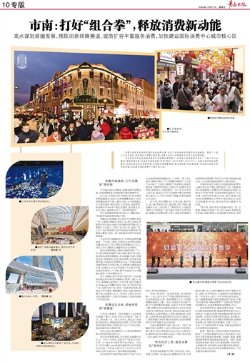 激发消费新潜能,塑强发展新优势。“下一步,我们将聚焦商圈‘环境、发展、载体’等方面,推动特色消费场景建设,加快商圈时尚化、智慧化改造,发展智能、时尚、绿色消费,优化夜间消费环境,丰富夜间消费特色业态。”市南区商务局商贸科科长李堃介绍,在闲置商业载体盘活方面,市南区从产业空间拓新、产业迭代升级、运营服务提优三个方面,提升和盘活14处闲置商业载体,开辟消费新空间。