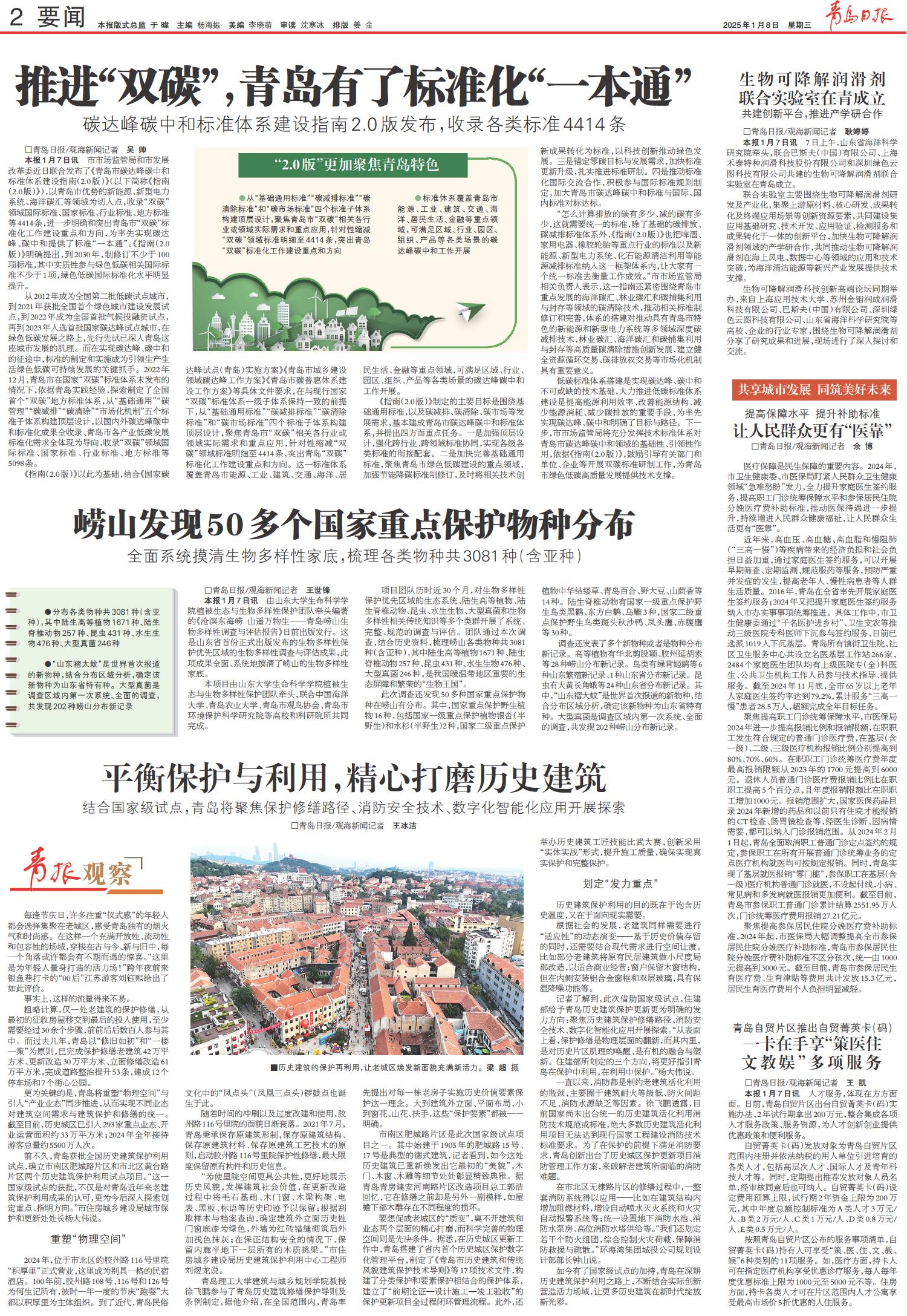 “怎么计算排放的碳有多少、减的碳有多少,这就需要统一的标准,除了基础的碳排放、碳减排标准体系外,《指南(2.0版)》也把啤酒、家用电器、橡胶轮胎等重点行业的标准以及新能源、新型电力系统、化石能源清洁利用等能源减排标准纳入这一框架体系内,让大家有一个统一标准去衡量工作成效。”市市场监管局相关负责人表示,这一指南还紧密围绕青岛市重点发展的海洋碳汇、林业碳汇和碳捕集利用与封存等领域的碳清除技术,推动相关标准制修订和完善,体系的搭建对推动具有青岛市特色的新能源和新型电力系统等多领域深度碳减排技术,林业碳汇、海洋碳汇和碳捕集利用与封存等高质量碳清除措施创新发展,建立健全资源循环交易、碳排放权交易等市场化机制具有重要意义。