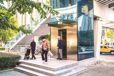 ■黑龙江路中海国际社区天桥的无障碍垂直电梯方便老年人出行。