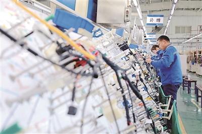 ▲2月3日,西海岸新区隐珠街道青岛三承电装有限公司生产车间,工人正加紧生产汽车线束。