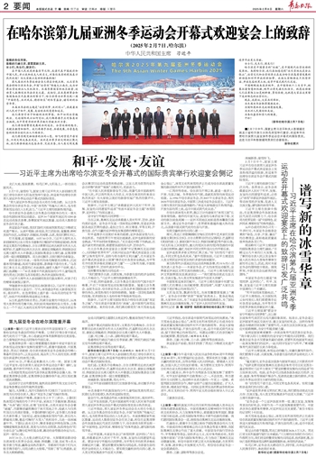 第九届亚洲冬季运动会圣火将在今晚点燃。从北京冬奥会到哈尔滨亚冬会,中国“冰雪热”传遍大江南北,也为世界冰雪运动注入生机活力。本届参赛国家和地区数量、运动员人数都创亚冬会历史之最。我相信,在亚奥理事会和各国各地区代表团共同努力下,哈尔滨将为世界呈现一届“中国特色、亚洲风采、精彩纷呈”的体育盛会,谱写新的冰雪华章。