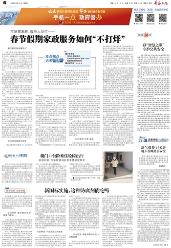 青岛市公共就业和人才服务中心家庭服务业促进部副部长岳作强介绍,每年春节假期,各大城市对保洁服务和顶班保姆、月嫂的需求都很旺盛,青岛也不例外。“不少家政服务企业招募兼职增加人手,并通过提高薪酬来鼓励一线员工在岗。”岳作强认为,要规范、提升假期家政行业服务质量,不仅要从“数”入手,还要提“质”,持续提升从业人员的职业技能水平。近年来,青岛市“春风行动”持续关注家政服务业用人需求,通过进职业院校和举办“家政服务大集”招募人才。同时,举办家政服务领域的技能培训、专业比赛及服务明星评选,不断提升从业人员的技能和素养。