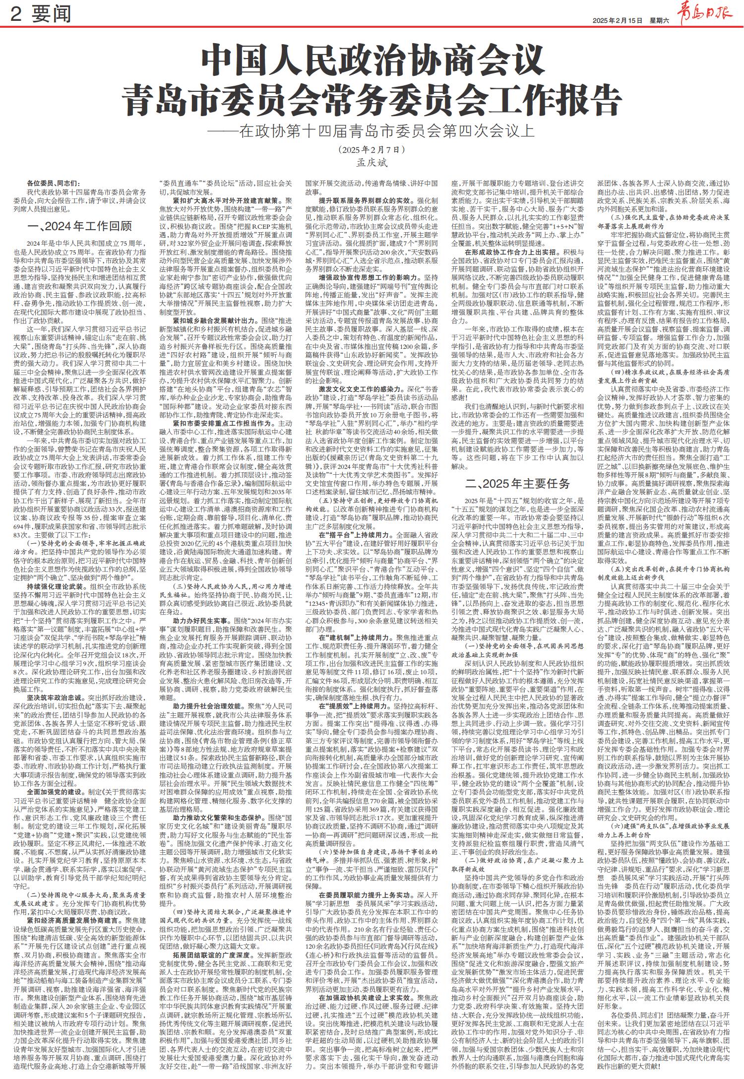 2025年是“十四五”规划的收官之年,是“十五五”规划的谋划之年,也是进一步全面深化改革的重要一年。市政协常委会要坚持以习近平新时代中国特色社会主义思想为指导,深入学习贯彻中共二十大和二十届二中、三中全会精神,认真贯彻落实习近平总书记关于加强和改进人民政协工作的重要思想和视察山东重要讲话精神,深刻领悟“两个确立”的决定性意义,增强“四个意识”、坚定“四个自信”、做到“两个维护”,在省政协有力指导和中共青岛市委坚强领导下,发扬优良传统,牢记政治责任,锚定“走在前、挑大梁”,聚焦“打头阵、当先锋”,以昂扬向上、奋发进取的姿态,担当思想引领之责、释放协商聚识之效、彰显服务大局之为,持之以恒推动政协工作提质效、创一流,为推进中国式现代化青岛实践广泛凝聚人心、凝聚共识、凝聚智慧、凝聚力量。
