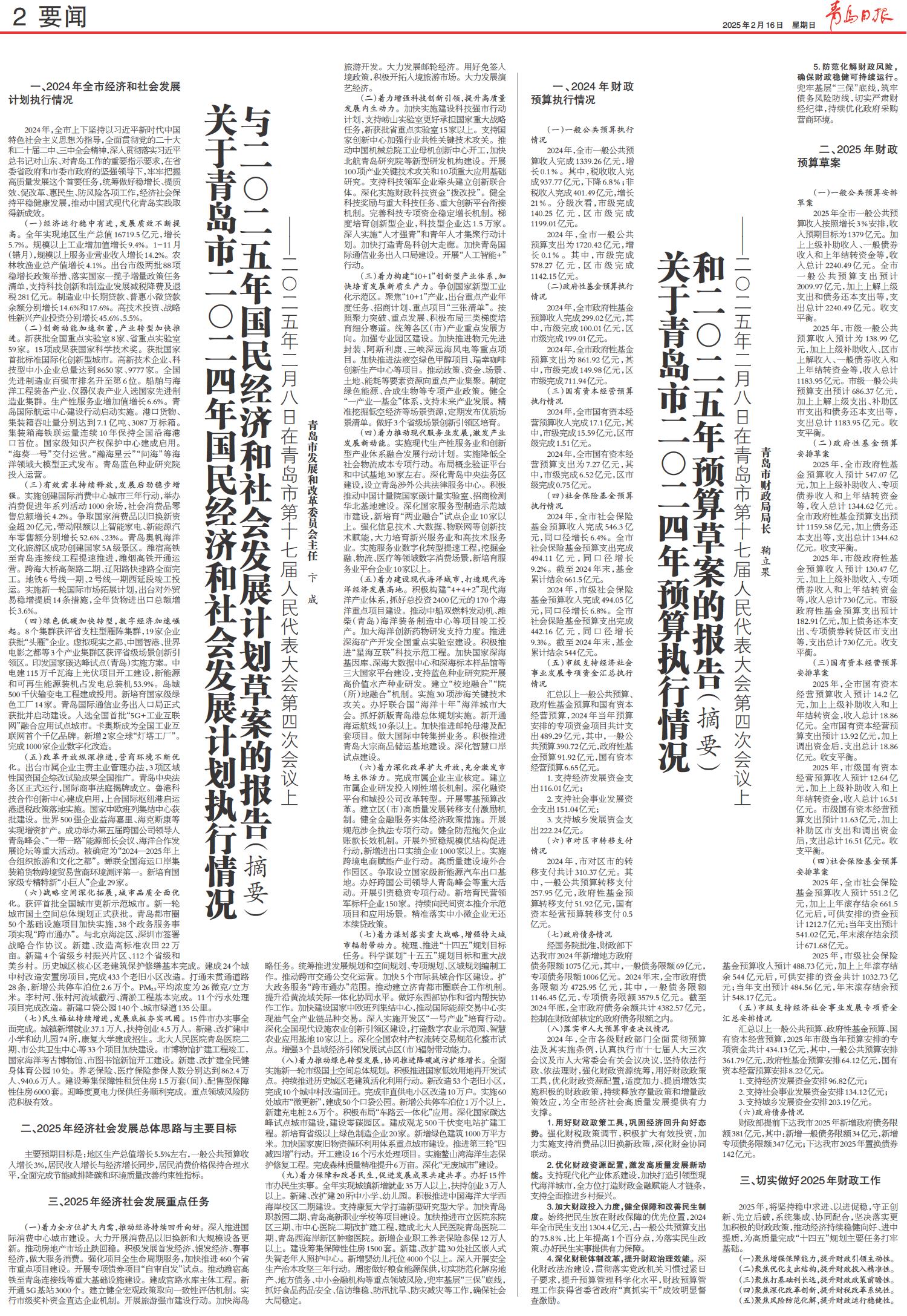 (二)创新动能加速积蓄,产业转型加快推进。新获批全国重点实验室8家、省重点实验室59家。15项成果获国家科学技术奖。获批国家首批标准国际化创新型城市。高新技术企业、科技型中小企业总量达到8650家、9777家。全国先进制造业百强市排名升至第6位。船舶与海洋工程装备产业、仪器仪表产业入选国家先进制造业集群。生产性服务业增加值增长6.6%。青岛国际航运中心建设行动启动实施。港口货物、集装箱吞吐量分别达到7.1亿吨、3087万标箱。集装箱海铁联运量连续10年保持全国沿海港口首位。国家级知识产权保护中心建成启用。“海葵一号”交付运营。“瀚海星云”“问海”等海洋领域大模型正式发布。青岛蓝色种业研究院投入运营。