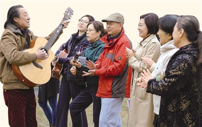 ▲老年人在李沧区九水街道延川路社区养老服务站参加吉他课堂。