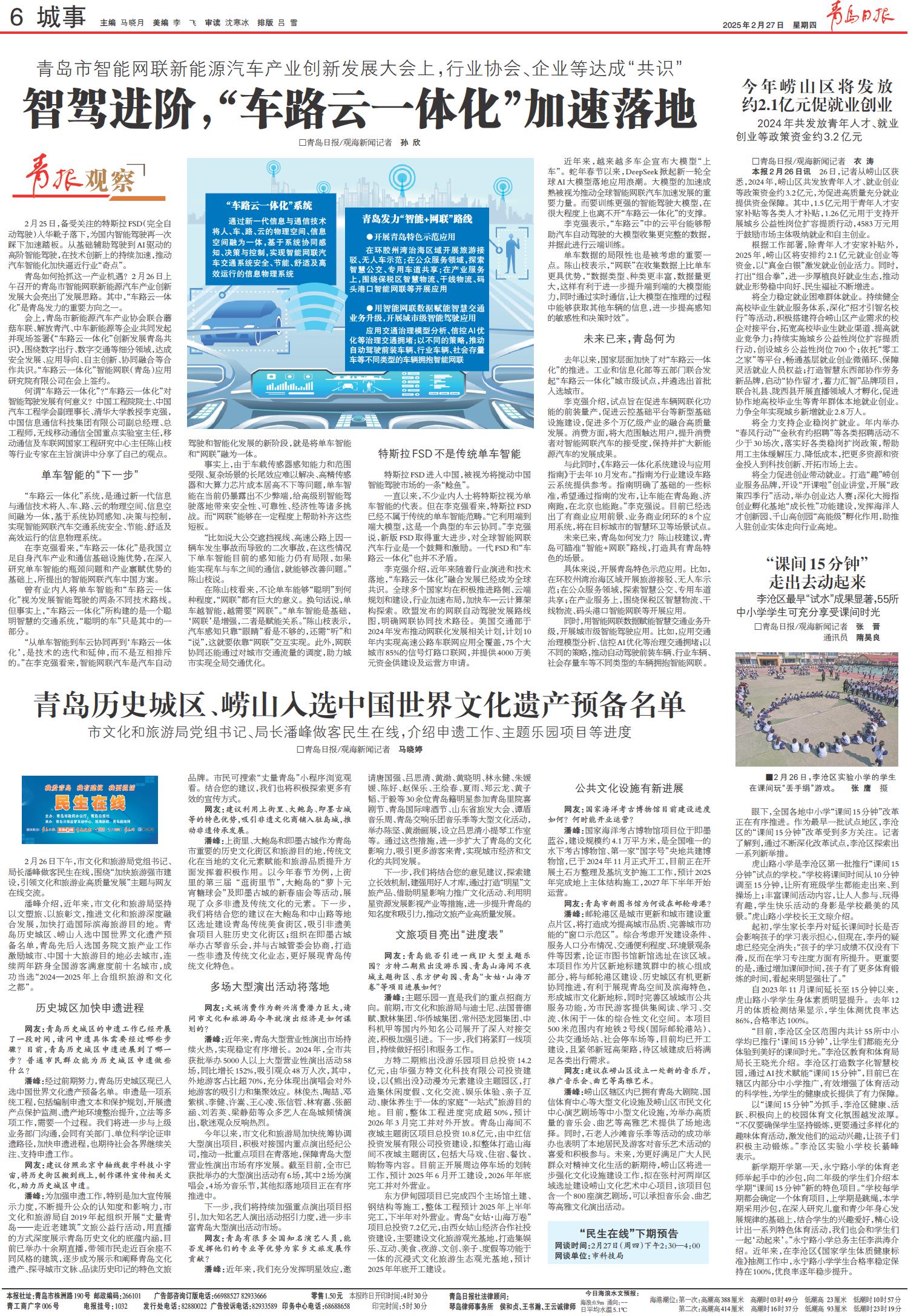 潘峰:经过前期努力,青岛历史城区现已入选中国世界文化遗产预备名单。申遗是一项系统工程,包括编制申遗文本和保护规划,开展遗产点保护监测、遗产地环境整治提升,立法等多项工作,需要一个过程。我们将进一步与上级业务部门沟通,会同有关部门、单位科学论证申遗路径,加快申遗进程,也期待社会各界继续关注、支持申遗工作。
