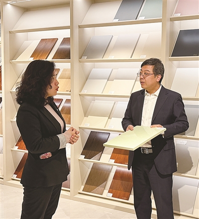 ■王刚(右)与工作人员交流家居产品生产销售情况。 刘佳旎 摄