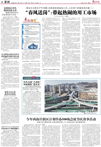 人勤春来早,开局势头足。春节过后,青岛多个行业进入用工高峰期,记者在采访中看到,企业抓生产忙招聘,多措并举求贤才;求职者跑招聘会、上技能培训班,期待早就业就好业;人社部门组团跨省招工、专列接送,全力促匹配稳就业……特别是“春风行动”暨就业援助月活动启动以来,热闹的用工市场传递出青岛经济发展“开门稳”“势头足”的强烈信号。