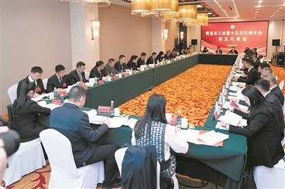 ■参加青岛市工会第十五次代表大会的代表们分组讨论工会工作。