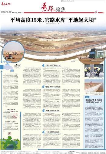 官路水库工程是国家水网重要节点,也是省内在建最大调蓄水库,总库容2.11亿立方米,规划设计年调蓄水量5.8亿立方米,将与棘洪滩水库一起构建起“双渠双库”客水调蓄架构,保障青岛供水安全。工程主要建设内容包括围坝、入库泵站、青岛出库泵站、高密平度出库泵站、泄洪放空洞、墨水河及顺溪河改道工程、引黄济青连接工程、管理设施及信息化工程等。