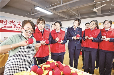■日前,国家税务总局青岛市市北区税务局青年志愿者服务队走进市北区春雨残疾人辅助就业中心,与中心的残疾朋友们共同制作和推介文创产品。图为志愿者们与特教老师一起制作手鼓锤。