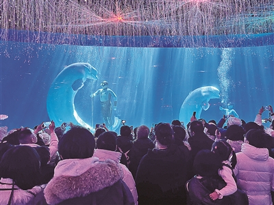 白鲸是极地海洋生物,不仅外形可爱,而且性格温顺,智商较高,能够完成复杂的动作。表演通过人与白鲸的互动,传递出人与自然和谐共处的理念。每逢演出,现场观众纷纷举起手机拍照留念,大家仿佛置身于纯净极地,感受着来自深海的温柔与奇迹,度过一场难忘的极地探秘之旅。 马晓婷