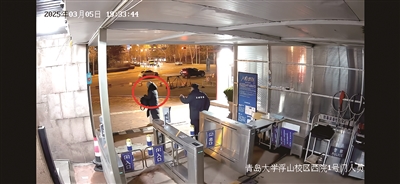 青岛大学浮山校区西院保安王加孝向记者回忆了当时的情景——当日19时32分,他像往常一样在岗亭执勤。这时,一位身着黑色长款羽绒服、头戴咖啡色帽子、佩戴口罩的女士快步走向岗亭。