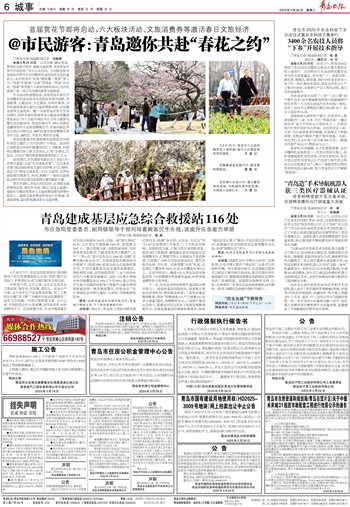 本报3月25日讯 以花为媒,邂逅青岛。聚焦拉动春日经济、提振文旅消费,首届青岛市赏花节活动将于近日正式启动。在创新呈现首届青岛市赏花节启动暨系列活动发布仪式的基础上,全市将举办“庆春”聚流量、“赏春”揽人气、“悦春”扩影响、“品春”尝美食、“探春”访文化、“惠春”享优惠六大板块的缤纷活动,为市民游客打造一场以花为媒的春季文旅盛宴。