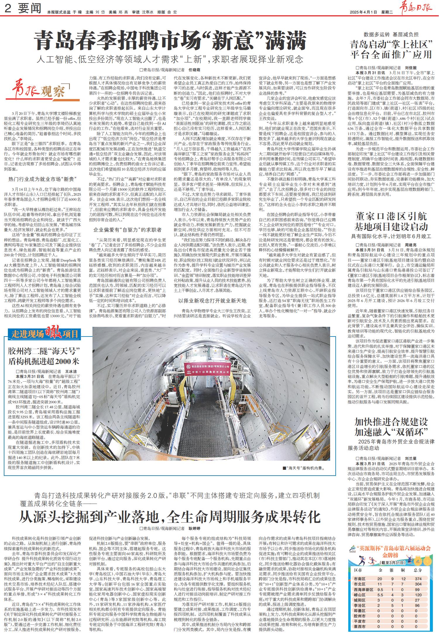 “我们也在努力探寻不同的路径,解决各行业人岗供需适配问题。”该负责人表示,近期,青岛出台《青岛市促进高质量充分就业若干措施》,明确加快发展现代职业教育,开展市属高校、职业院校(技工院校)就业状况评价,并以此作为参考,提升学科专业设置与城市产业发展的匹配度。同时,全面推行企业新型学徒制培训、“金蓝领”培训制度,落实职业技能培训差异化补贴政策,提升从业人员的技术技能素养,拓宽技能人才发展通道,让求职者在青岛这片热土上干事创业,人尽其才、各展其能。
