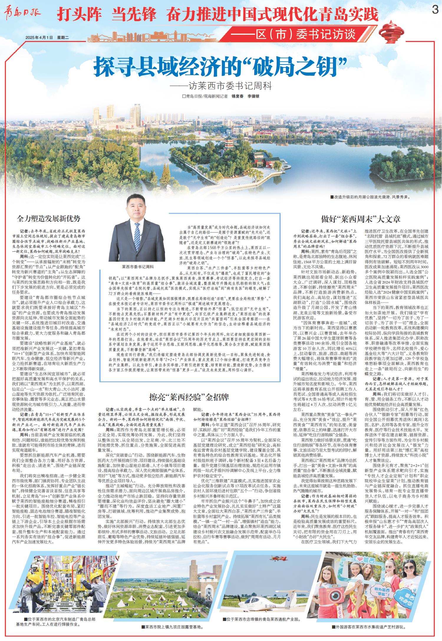 观愈宏而行若微。“我们将锚定塑造青岛北部协调发展新优势这一目标,聚焦先进制造、食品饮料、智能网联新能源汽车等‘2+2+1’产业体系,重点发展12个细分赛道,打造更具竞争力的产业集群。以此为牵引,拿出务实举措,不断引进新变量、培育新动能、塑造新优势,全力推动各方面工作提质增效,让莱西带来的‘惊喜’更多一点。”谈及未来发展,周科信心满怀。