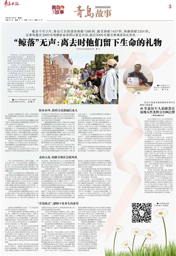 清明临近,人们在寄托哀思的同时,也在思考着生命的意义。一鲸落而万物生,遗体器官角膜捐献,如同世间最美的“鲸落”,在生命的尽头播种希望,成为青岛这座大爱之城的生动注脚。