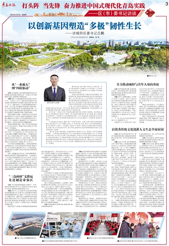 “越己者,恒越。”在青岛新一轮发展布局中,城阳正以五个“勇争先、作示范”重塑发展逻辑——在因地制宜发展新质生产力、科技创新和产业创新深度融合、进一步全面深化改革开放、全方位扩大内需、促进共同富裕上勇争先、作示范,推动先进制造业集聚区、创新创意引领区、中日韩地方经贸合作先行区、胶东经济圈消费中心区、人文生态幸福家园建设取得新的更大成效。“创造未来的前提是相信未来。城阳区当以创新为帆、科技为桨、产业为舵,奋力‘打头阵、当先锋’,朝着建设湾区都市活力城阳的目标稳驭行舟。”吕鹏说。