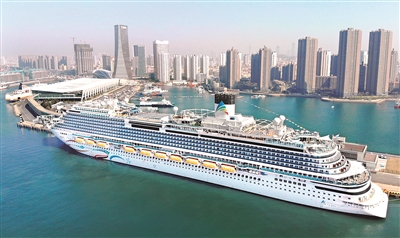 ■“爱达·魔都号”邮轮靠泊在青岛邮轮母港码头。 新华社照片