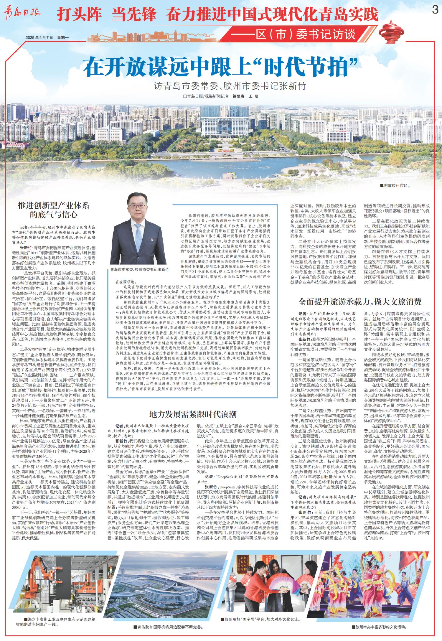 聚势,谋远,奋进。在进一步全面深化改革上当好排头兵,同心同向建设好现代化上合新区,这是胶州作答未来的试卷。“胶州市作为上合示范区核心区和临空经济示范区所在地,将用好两大‘国字号’平台,以创新型产业体系为主攻方向,以‘一镇一业’为底座支撑,发挥“链主”企业作用,从存量找增量、以链主建生态,统筹推进传统产业转型升级和新兴产业培育壮大。”青岛市委常委、胶州市委书记张新竹表示。