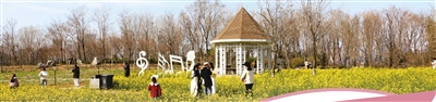 ■唐岛湾湿地公园里的油菜花绽放,市民游客在此尽享春光。梁 超 摄