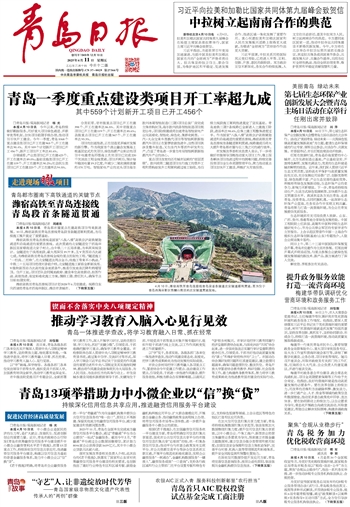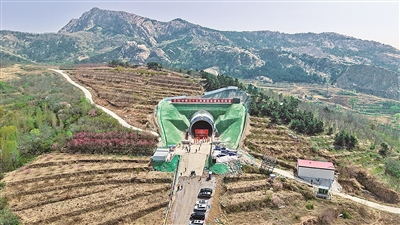 4月10日,潍宿高铁至青岛连接线青岛段首条隧道北安隧道顺利贯通,图为位于青岛西海岸新区铁橛山附近的北安隧道贯通现场。