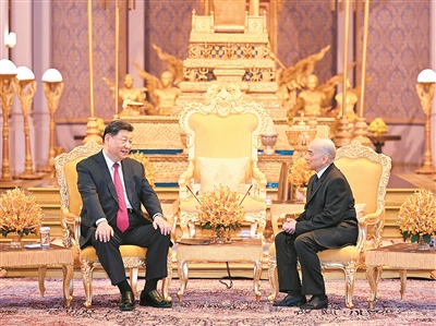 4月17日下午,柬埔寨国王西哈莫尼同中国国家主席习近平在金边王宫举行会见。