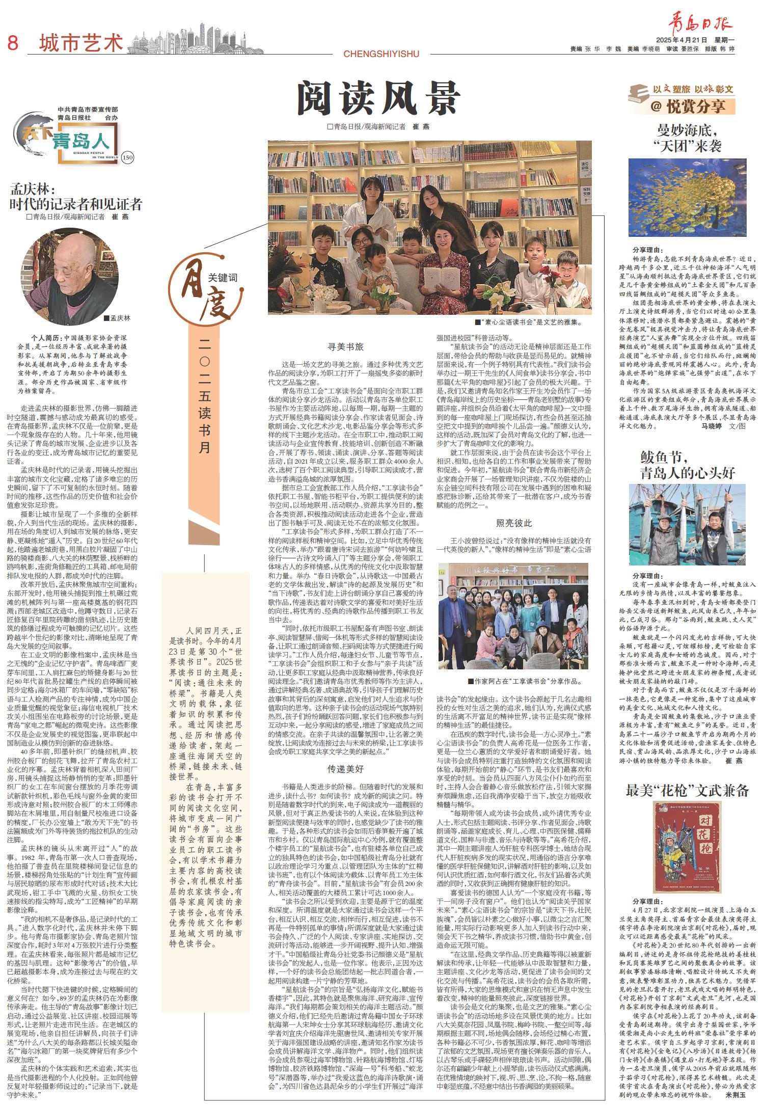 在青岛,丰富多彩的读书会打开不同的阅读文化空间,将城市变成一间广阔的“书房”。这些读书会有面向企事业员工的职工读书会,有以学术书籍为主要内容的高校读书会,有扎根农村基层的农家读书会,有倡导家庭阅读的亲子读书会,也有传承优秀传统文化和彰显地域文明的城市特色读书会。