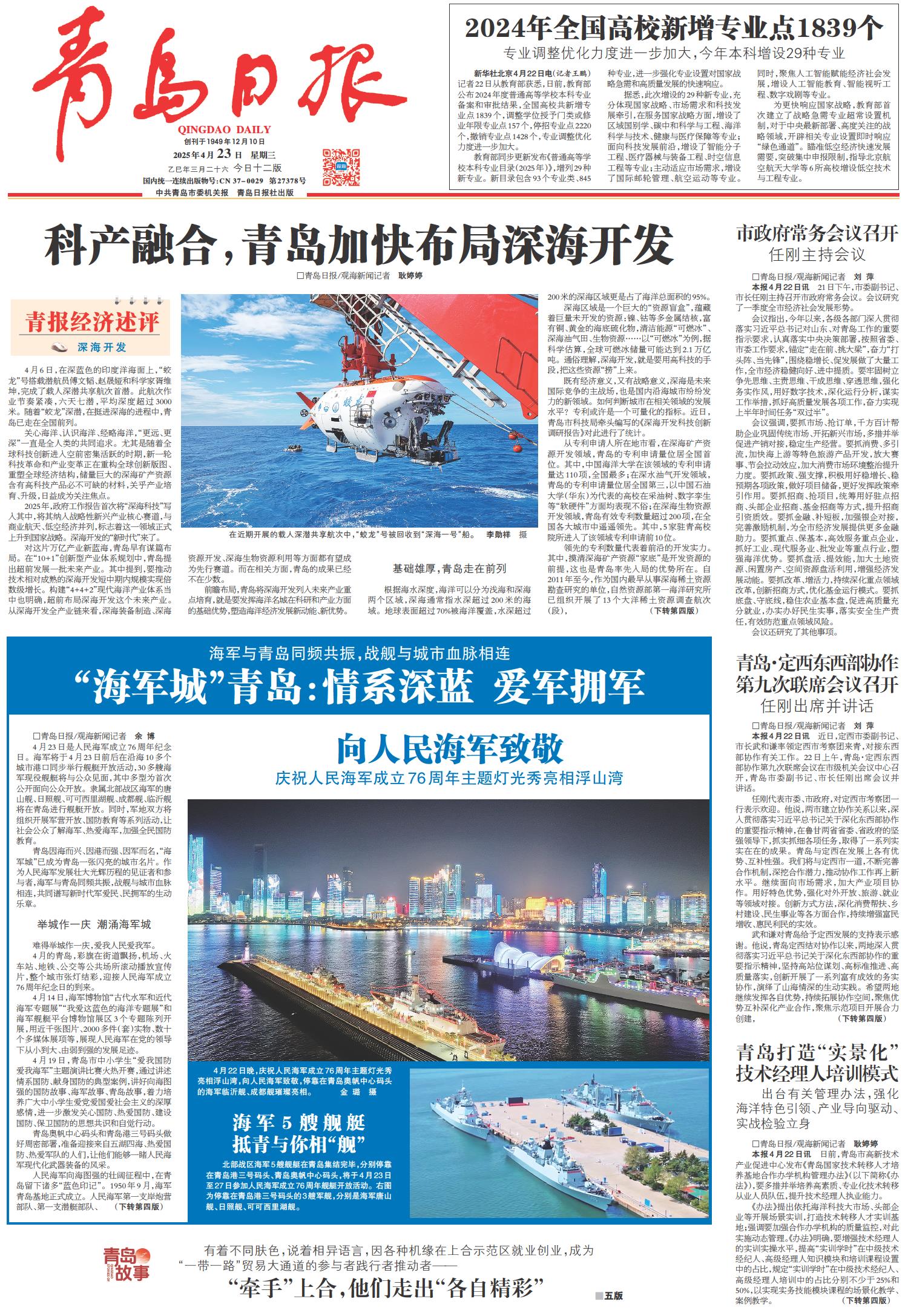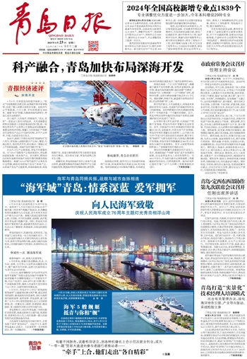4月的青岛,彩旗在街道飘扬,机场、火车站、地铁、公交等公共场所滚动播放宣传片,整个城市张灯结彩,迎接人民海军成立76周年纪念日的到来。