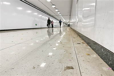 辽阳西路劲松二路路口处的地下通道内,地面上堆积了不少污渍和杂物。