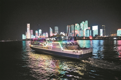 入夜的奥帆中心人流如织,随处可见拍照打卡的国内外游客。当游船缓缓驶出,市民游客纷纷走出船舱,感受海风轻拂的浪漫春夜。船行海上,如在画中,“五月的风”雕塑、青岛国际会议中心、情人坝、海上剧场等地标景观徐徐铺展。沿途,浮山湾灯光秀绚丽夺目,沿岸高楼大厦化作光影画布,五彩斑斓的灯光在夜空中交织,倒映在波光粼粼的海面,如梦似幻。光影画卷之间,“光影青岛,星耀华表”出现在青岛海天中心楼体上,尽显青岛都市风采。