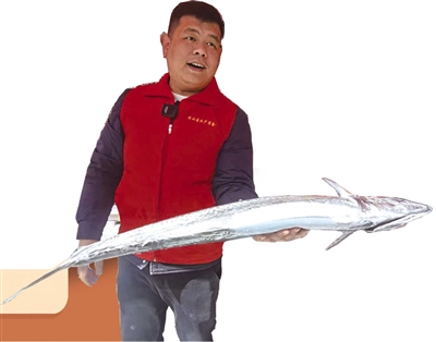 ■青岛2025第二十一届沙子口鲅鱼节开幕现场,工作人员展示新鲜鲅鱼。